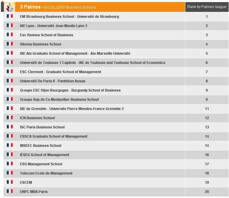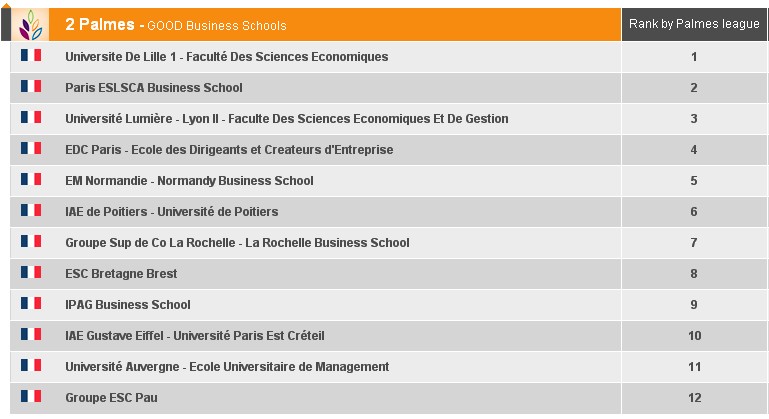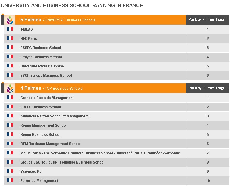 法国的商科教育被划分在公立大学和专业的商学院里。以下排名是EDUNIVERSAL机构根据毕业生就业情况,以及社会认可度等作出的混合排名。