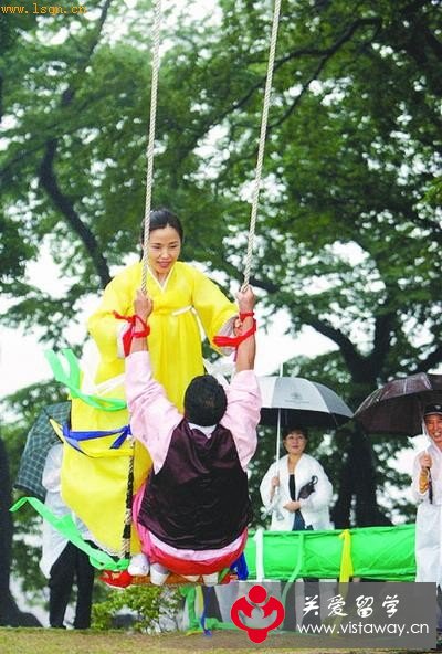 秋千 韩国妇女和儿童逢年过节时的一种传统游戏。比赛时以高度决定胜负。一般是指定一个树梢为目标,看谁能踢到或咬到。有的是挂一个铃铛,秋干越荡越高,铃铛也越升越高,直到脚碰不到为止。
